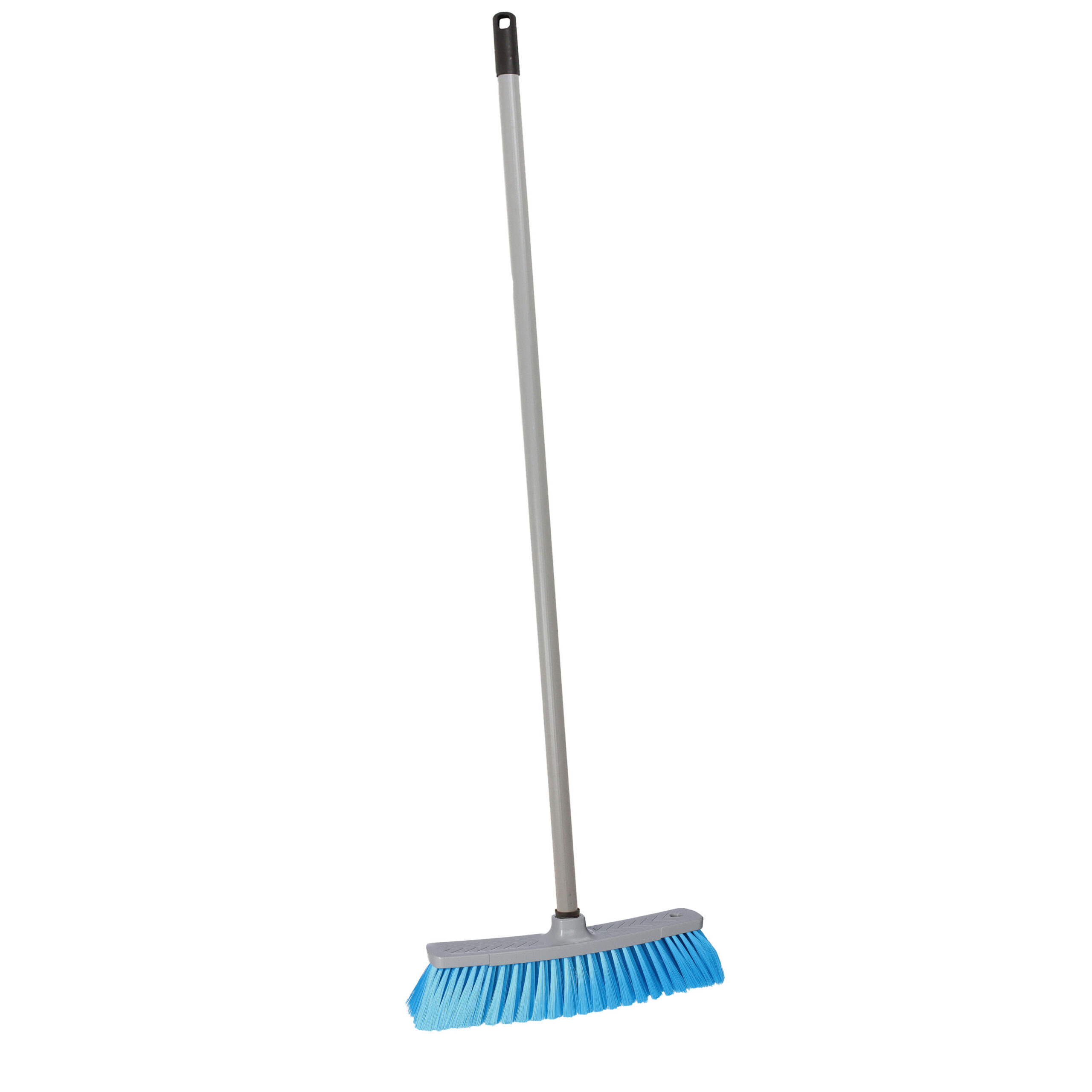 Bezem voor binnen gebruik in huis met een zachte stevige bezemkop in de hoofdkleur turquoise. Materiaal kop: kunststof/synthetische zachte haren. De kunststof steel is 130 cm lang, gemaakt van kunststof, met schroefdraad en is niet inschuifbaar. De lange steel is in de kleur grijs en heeft een ophangoog. Gebruik de binnenbezem voor het verwijderen van droog vuil binnenshuis op nagenoeg alle soorten vloeren, behalve tapijt. Ook geschikt als bezem voor camper, caravan of voortent. , Dit artikel bestaat uit:, 1x Buemag bezemkop zacht – 34.5 cm – kunststof – grijs/blauw – binnen, 1x Universeel bruikbare Bezemsteel – schroefdraad – metaal/kunststof – grijs – 120 cm – ophang oog