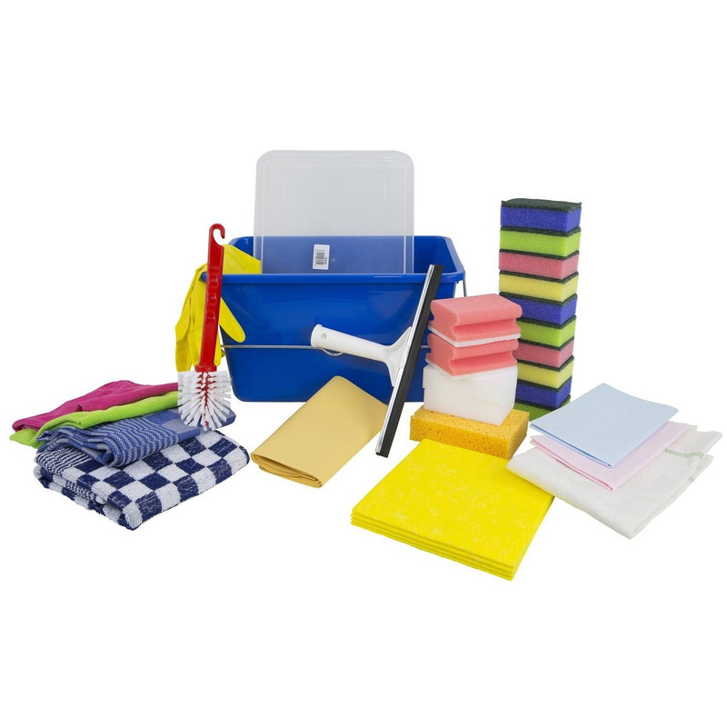 Inhoud: schuursponzen (10 stuks), vaatdoekjes (3 stuks), afwasborstel, theedoek, keukendoek, raamtrekker (25 cm), super zeem, viscose spons, dweil, sanitair spons, wonderspons, microvezeldoek, microvezelglansdoek, afwashandschoenen en emmer met deksel (12 liter). Kleur: multi.