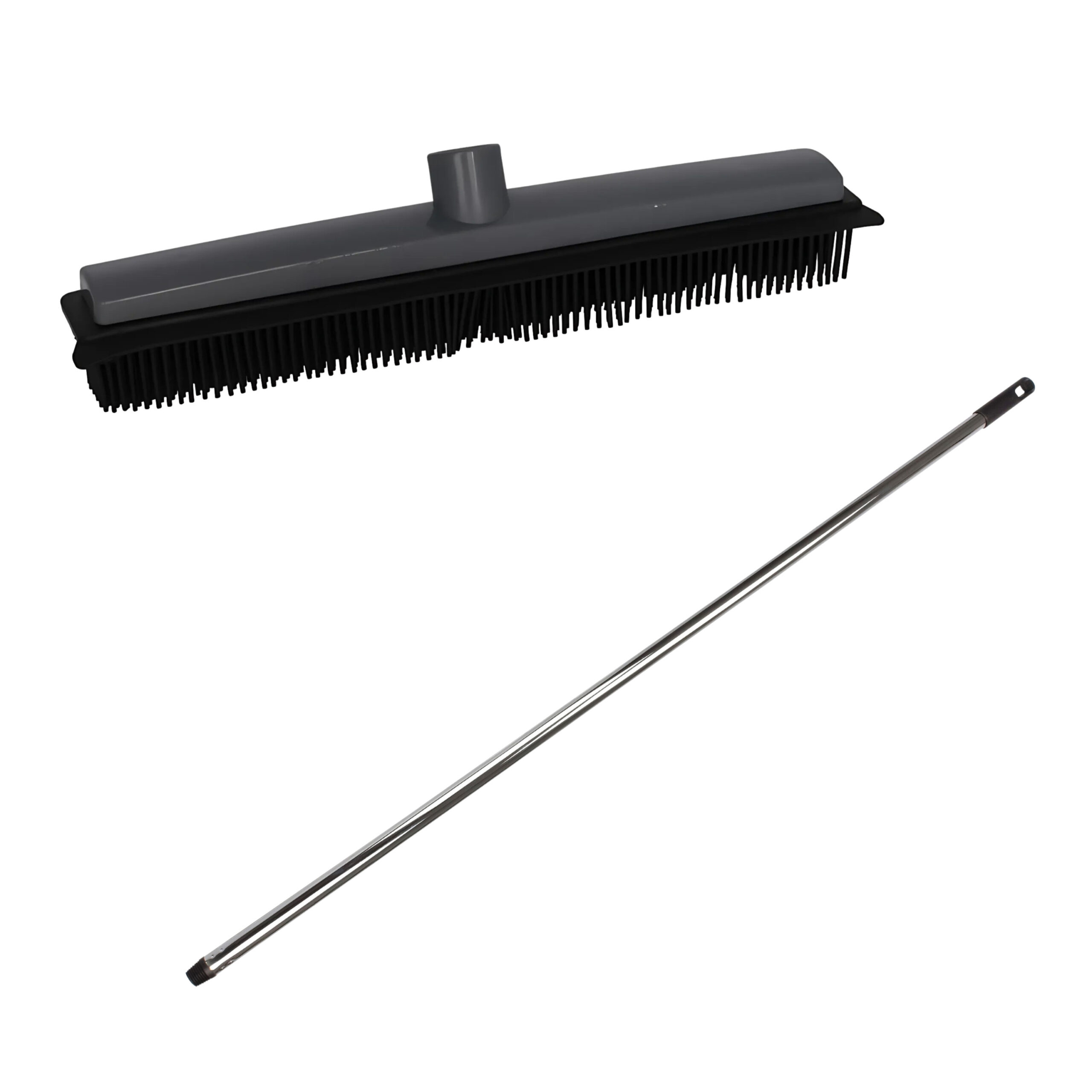 Deze praktische schoonmaakcombinatie bestaat uit een extra lange, verchroomde bezemsteel van 130 cm met een rubberen bezemkop van Gerimport (31 cm breed). Dankzij het universele schroefdraad is deze set direct klaar voor gebruik in huis, tuin of op werkvloer. De verchroomde steel is robuust, roestbestendig en voorzien van een ophangoog, terwijl de flexibele siliconen/rubber borstelharen van de kop zorgen voor een grondige ?n krasvrije reiniging van elk oppervlak ? van tegels tot tapijt en van laminaat tot parket. Zelfs dierenharen zijn geen partij voor deze schoonmaakkracht!