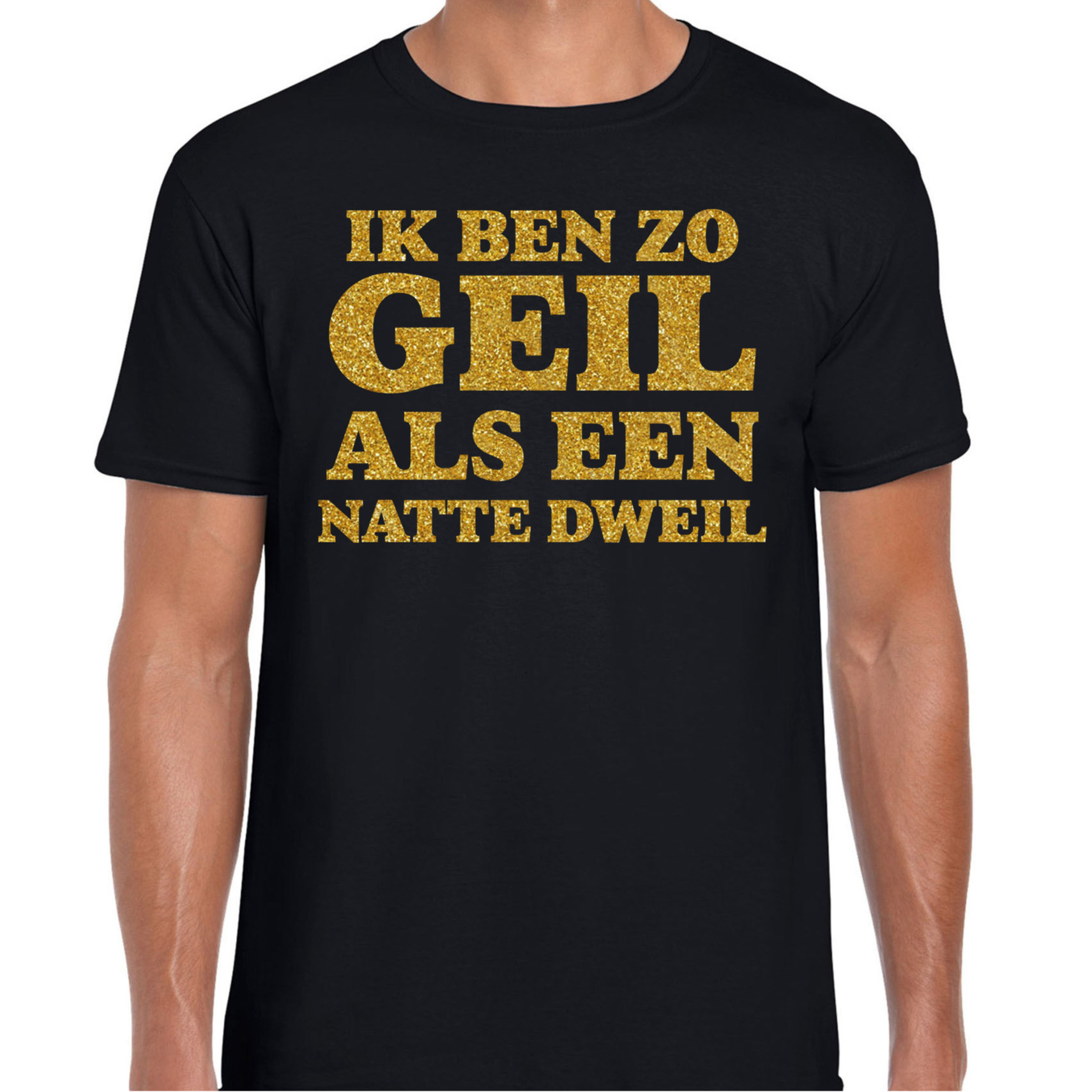 Met dit verkleed T-shirt voor heren trek je gegarandeerd de aandacht op elk fout/goud/stout themafeest. De glittergouden opdruk “Ik ben zo geil als een natte dweil” maakt dit shirt d? ultieme keuze voor wie niet bang is voor een knipoog en een flinke dosis humor. Het zwarte T-shirt vormt het perfecte contrast met de sprankelende tekst, terwijl de comfortabele pasvorm ervoor zorgt dat jij de hele avond fout ?n fabulous blijft. Het shirt is ideaal te combineren met een foute broek of juist met gouden accessoire voor die extra “fout, goud, stout” touch. Perfect voor feestjes waar alles mag en niks moet! Stout, goud of gewoon lekker fout? Met dit T-shirt maak jij sowieso een statement op elk feest! Durf op te vallen, trek dit T-shirt aan en maak er een avond van om nooit te vergeten! Materiaal: 145 grams, 100% katoen. Merk: Bellatio Decorations.